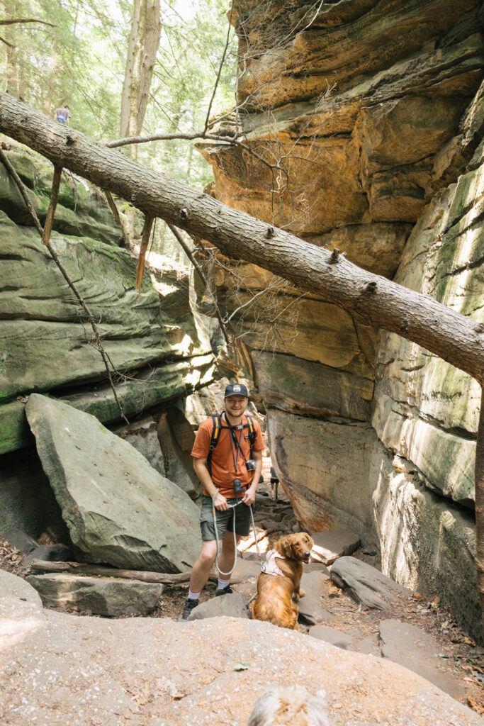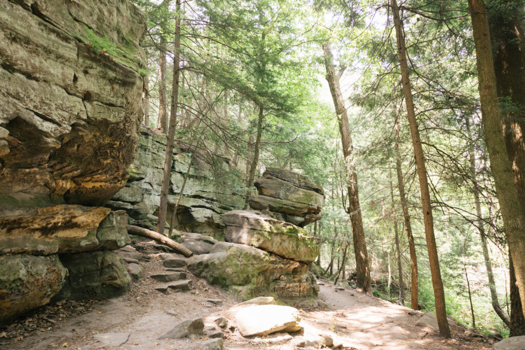 This 1.8-mile loop trail is one of our favorites in Cuyahoga Valley! You find yourself surrounded by sheer towering rocks, ledges, and trees. If you look closely enough at the rocks while you go through them, you’ll find some carvings and sketches on the stones. The best time of day to see the sunset here, but we also enjoyed it as an afternoon hike.