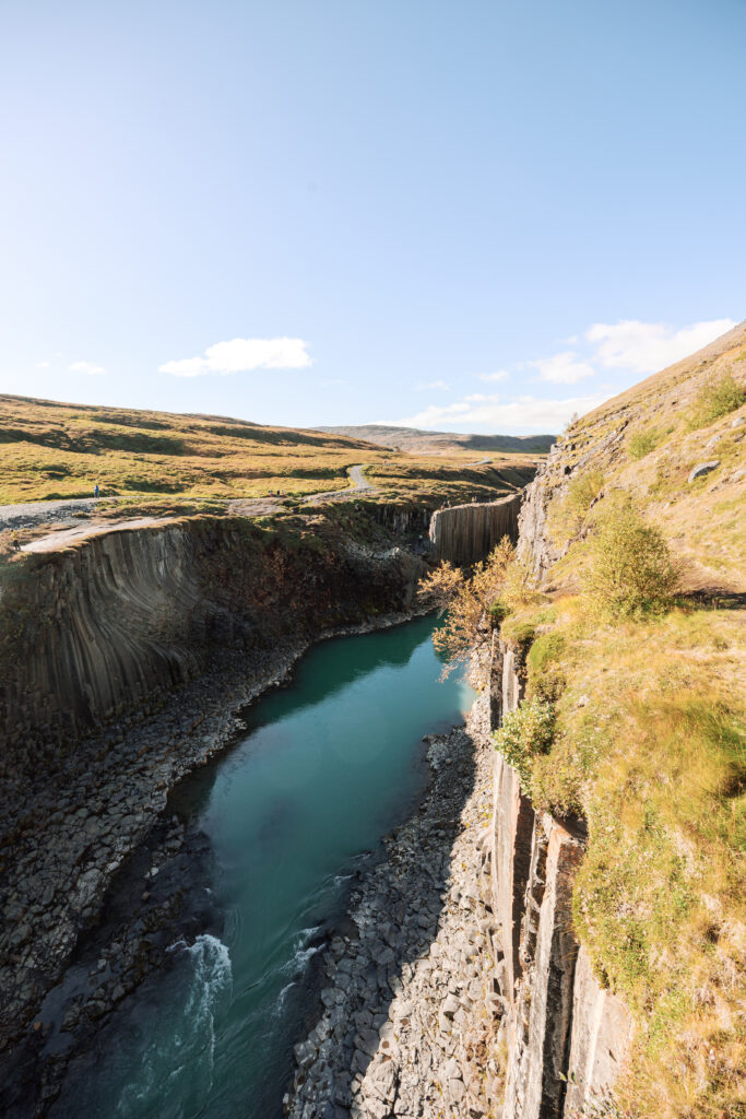 From Akureyri, we drove clear across the Northern Part of Iceland to end the night in Hofn. There is not a lot to see in the northern part of Iceland, except for a few waterfalls and the Myvatn hot springs. We skipped Myvatn and instead stopped at a few waterfalls and Stuðlagil Canyon. There are two ways to view Stuðlagil. You can view it from the main viewing platform, or you can drive down a short dirt road, park, and hike two miles back to where you can climb (a very sketchy, slippery path) down into the canyon to see it from the bottom. Due to time constraints and my illness, we opted to simply view the canyon from the main viewing platform. They were doing construction on the road, so it had become a dirt road, and it was quite sketchy to drive down without a 4-wheel drive vehicle.